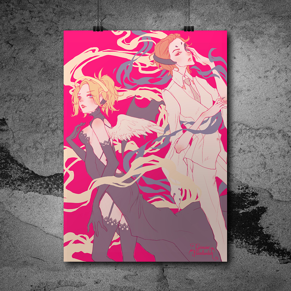 A3 sized print of Moira and Mercy from Overwatch.