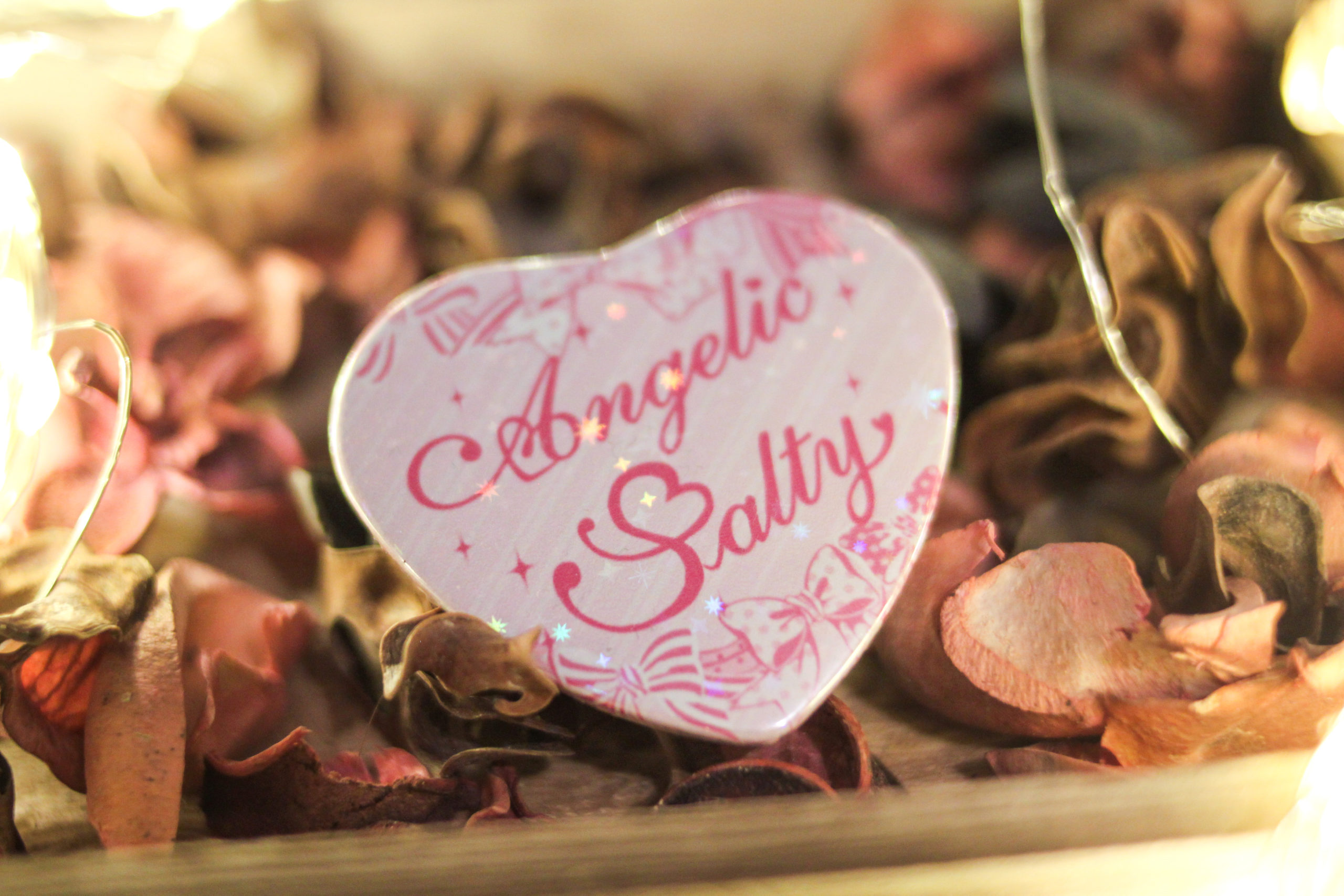 Cute custom shaped ‘Angelic Salty’ badge with holographic sparkles to fit onto your clothes or bag.